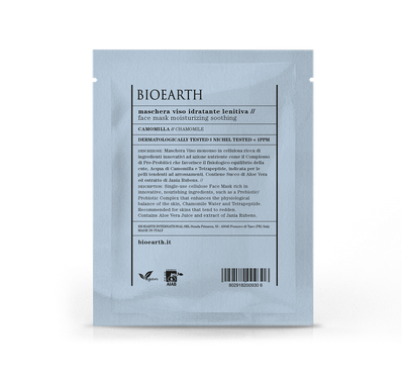 Maschera Viso monouso in cellulosa ricca di ingredienti innovativi ad azione nutriente come il Complesso di Pre-Probitici che favorisce il fisiologico equilibrio della cute, Acqua di Camomilla e Tetrapeptide, indicata per le pelli tendenti ad arrossamenti. Contiene Succo di Aloe Vera ed estratto di Jania Rubens.