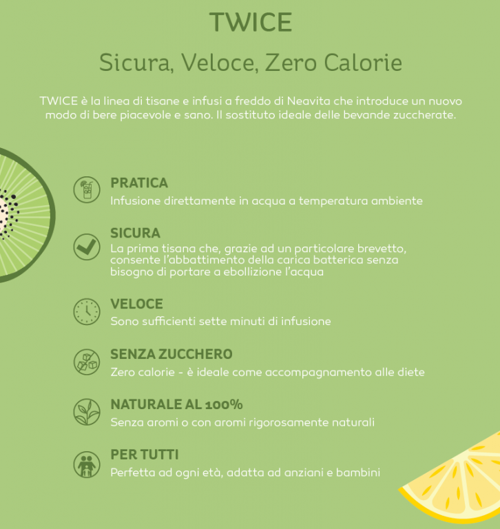 TWICE infusi a freddo, grazie all'innovato brevetto che abbatte la carica batterica, libera le proprietà benefiche degli infusi in tutta sicurezza, consentendo l'infusione a temperatura ambiente.