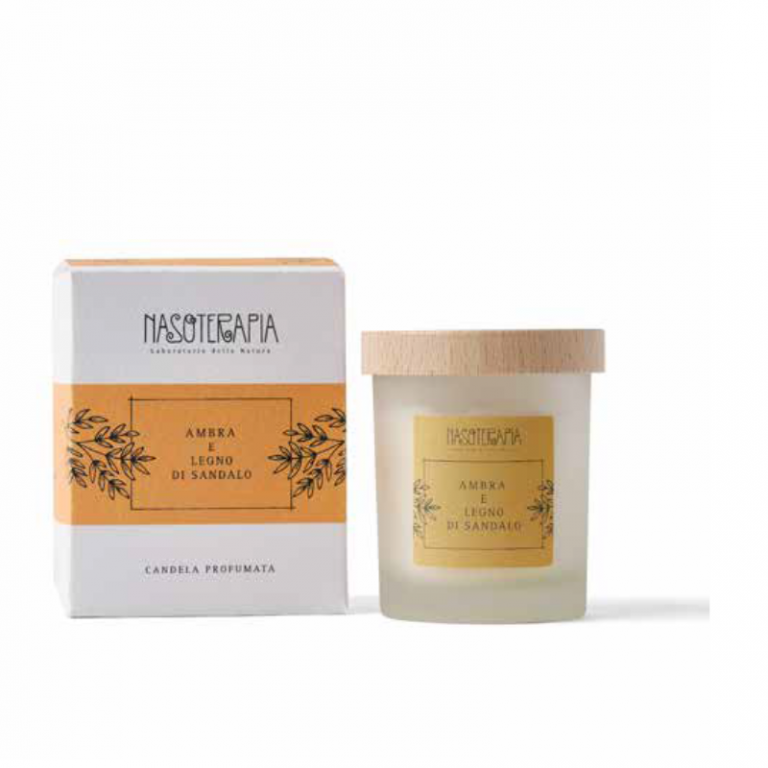 Candela profumata Ambra e legno di sandalo 180 gr Nasoterapia Le nostre candele sono realizzate con cura in Italia con una miscela di cere vegetali ed una piccola percentuale di paraffina ultra raffinata. Lo stoppino, in cotone 100% biologico, ne assicura una corretta combustione; l’elegante contenitore in vetro satinato si completa di un pratico tappo in legno di faggio, rendendo ogni candela un oggetto ricercato.