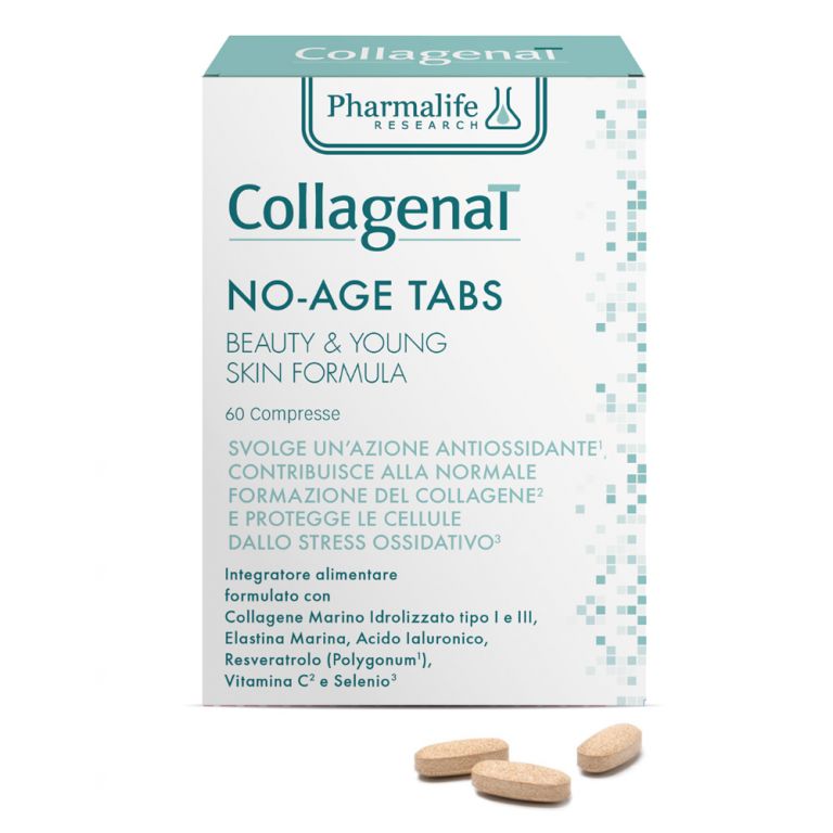 Collagenat No-Age Tabs è un integratore alimentare a base di collagene marino idrolizzato di tipo I e III, elastina marina e principi attivi funzionali, dalla spiccata attività antiossidante utile come supporto per il benessere della pelle. Contiene infatti l’estratto di polygonum, ricco in resveratrolo, che svolge un’attività antiossidante, la vitamina C che contribuisce alla normale formazione del collagene per la normale funzione della pelle, oltre al selenio che protegge le cellule dallo stress ossidativo.