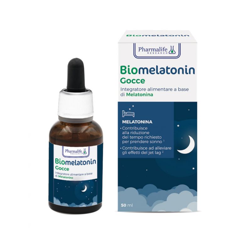 Biomelatonin Gocce è un integratore alimentare in gocce esclusivamente a base di Melatonina. La Melatonina contribuisce alla riduzione del tempo richiesto per prendere sonno; l’effetto benefico si ottiene con l’assunzione, poco prima di coricarsi, di 1 mg di Melatonina. La Melatonina contribuisce inoltre ad alleviare gli effetti del jet lag; l’effetto benefico si ottiene con l’assunzione, poco prima di coricarsi, di un minimo di 0,5 mg il primo giorno di viaggio e per alcuni giorni dopo l’arrivo a destinazione.