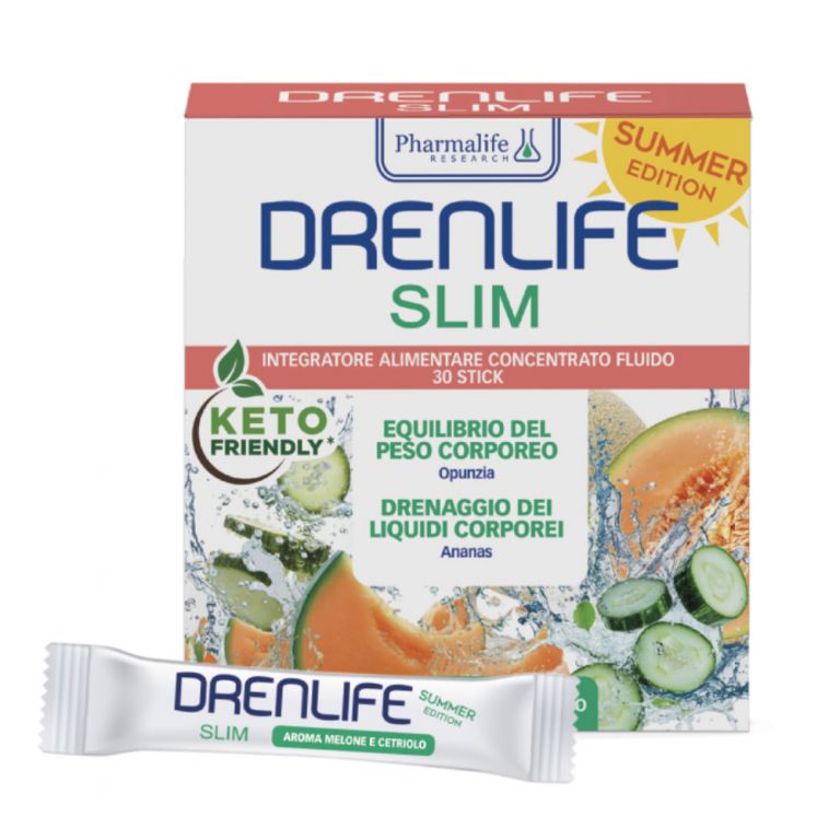 Drenlife Slim Summer Edition Stick è un integratore alimentare concentrato fluido in pratici stick da diluire in acqua a base di estratti vegetali, in particolare Ananas, Garcinia, Limone e Fico d’India (Opunzia). Il dissetante gusto melone e cetriolo rende il prodotto gradevole da assumere durante tutta la giornata.